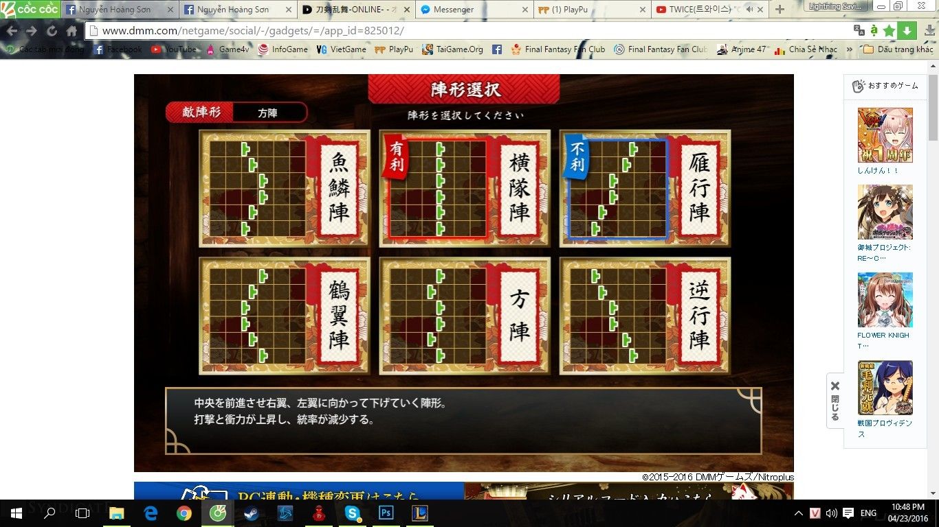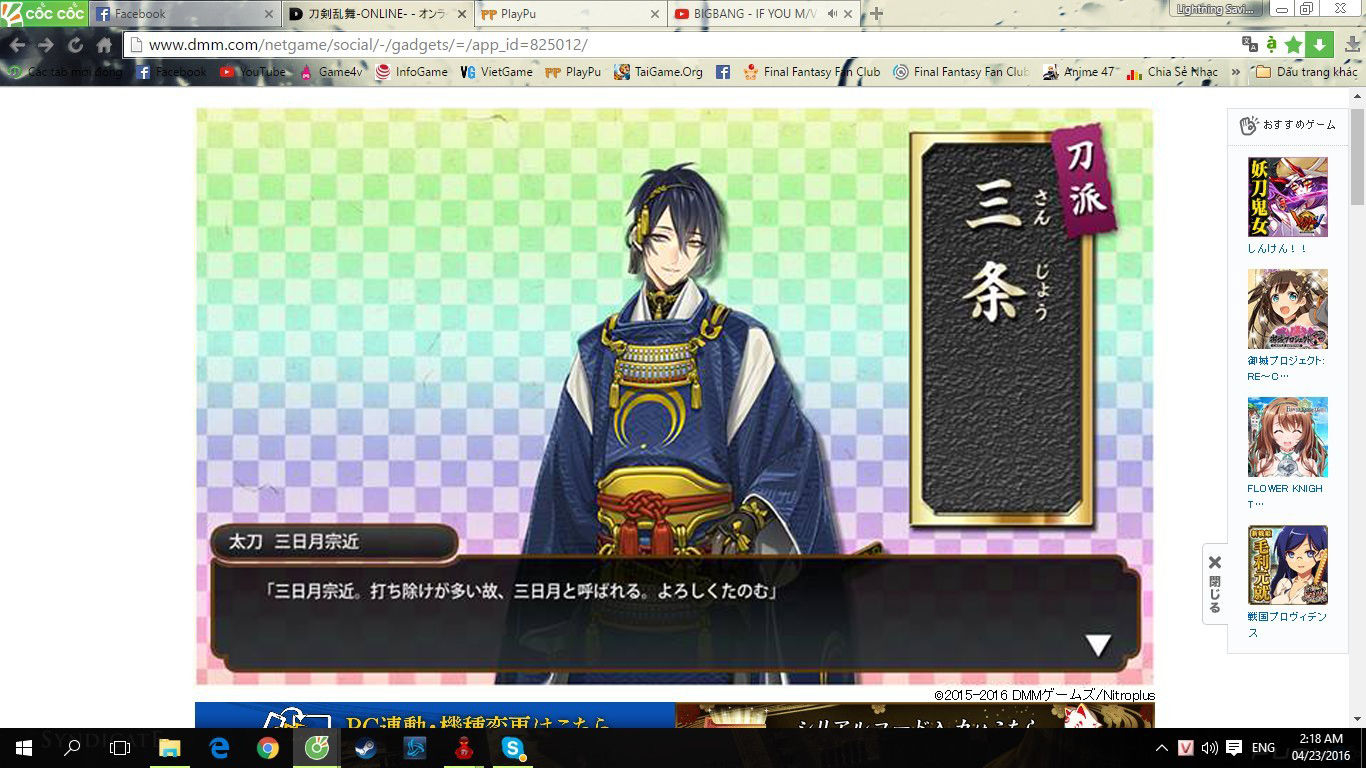 P/s: Đó vậy thôi :v các bạn có thể lên youtube search Touken Ranbu gameplay để có được cái nhìn tổng quan hơn. Ai đã chơi hoặc nếu ủng hộ hay có ý định chơi thử thì cho mình cái bình luận hay góp ý để cùng giúp đỡ và chia sẻ kinh nghiệm với nhau. Nếu ủng hộ thì mình sẽ xem xét ngồi viết một bài hướng dẫn toàn tập cho các bạn newbie, vì đây là game full tiếng Nhật, không có 1 tí tiếng Anh nào cả :v